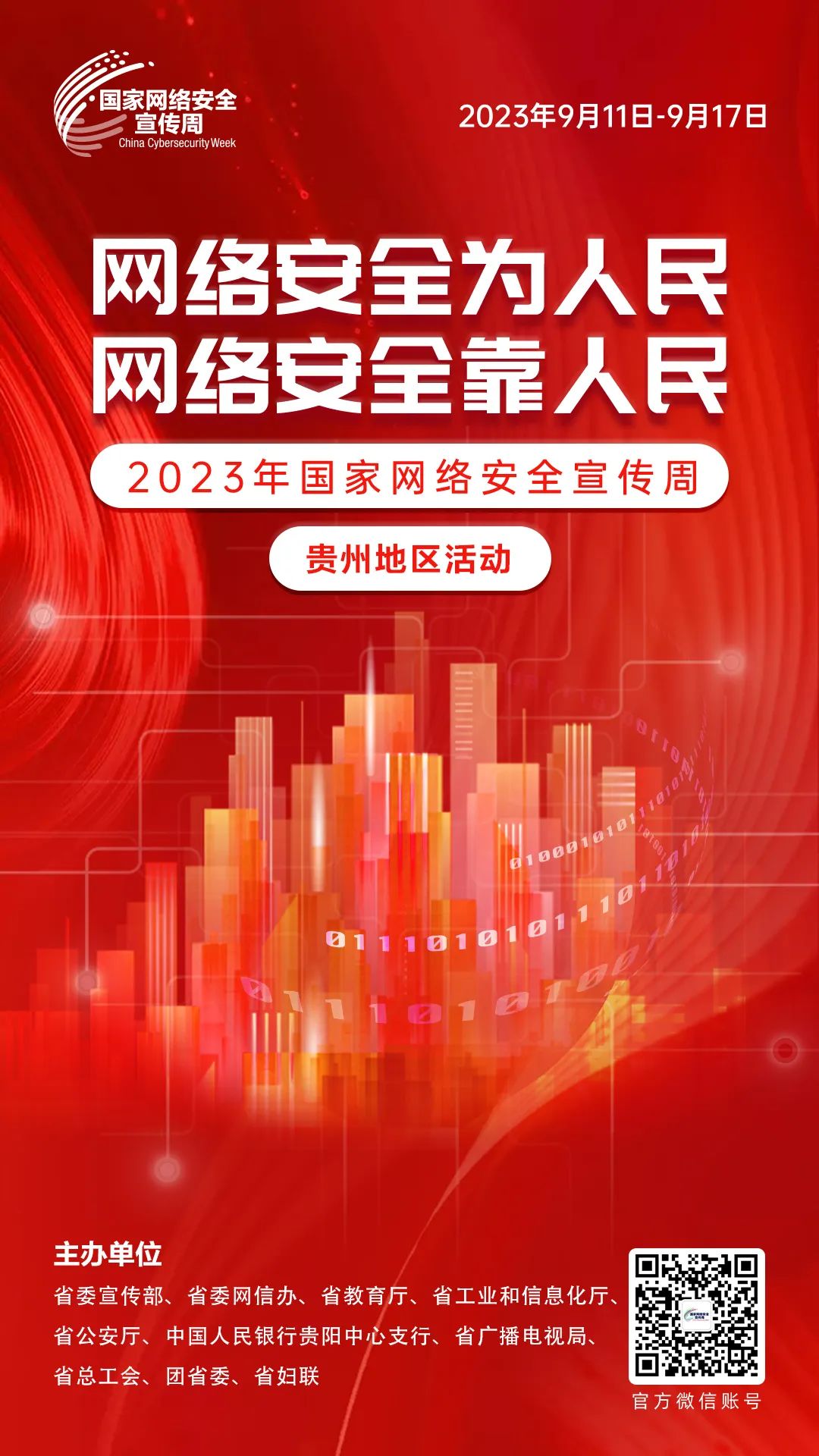 2023年国家网络安全宣传周贵州地区活动由省委宣传部、省委网信办、省教育厅、省工业和信息化厅、省公安厅、中国人民银行贵阳中心支行、省广播电视局、省总工会、团省委、省妇联等部门联合举办。
