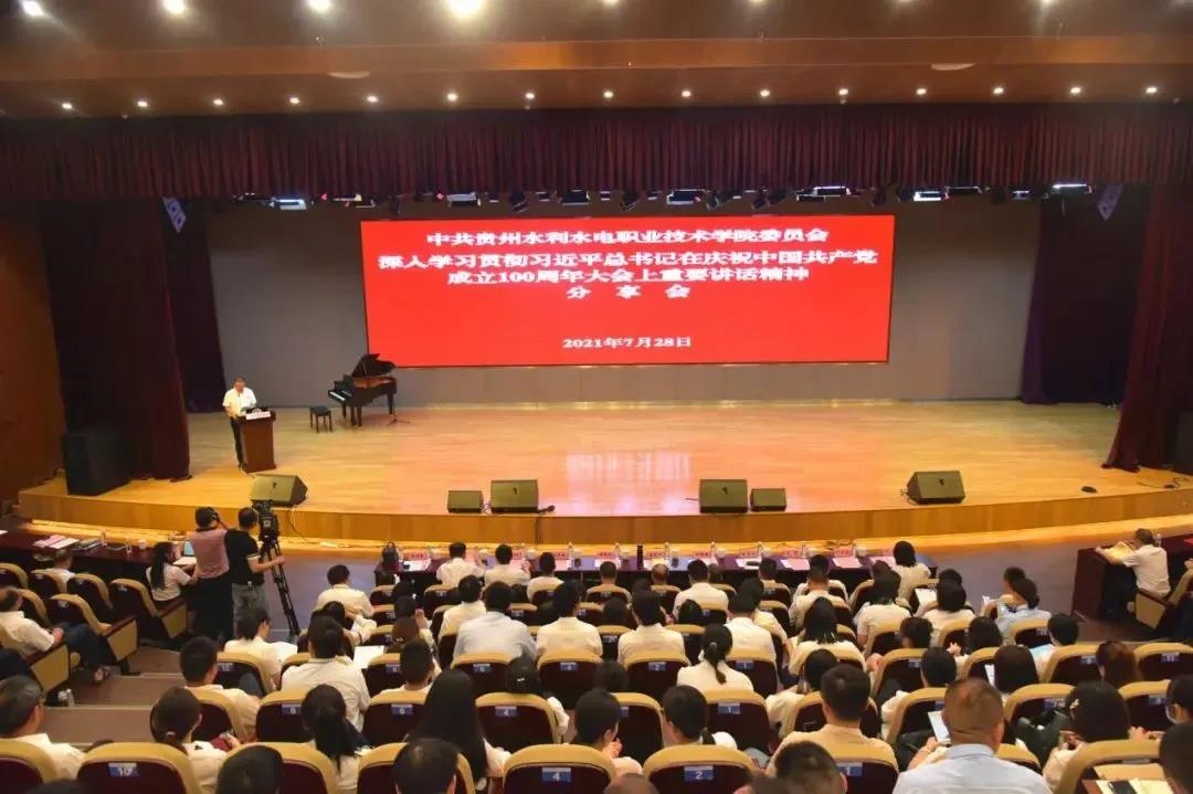 7月28日,贵州水利水电职业技术学院(以下简称“水职院”)党委召开深入学习贯彻习近平总书记在庆祝中国共产党成立100周年大会上的重要讲话精神分享会。省委党史学习教育第九巡回指导组副组长蒋益华,组员孙良政,省5278论坛 机关党委专职副书记、纪委书记周奇江,党史学习教育省委宣讲团成员、贵州财经大学马克思主义学院院长何伟福到会指导。学院党委书记杨志宏出席分享会并作总结讲话,党委副书记、院长陈海梁主持会议。学院领导班子成员,副科级及以上领导干部,全体党员、全体思政课教师、辅导员参会。