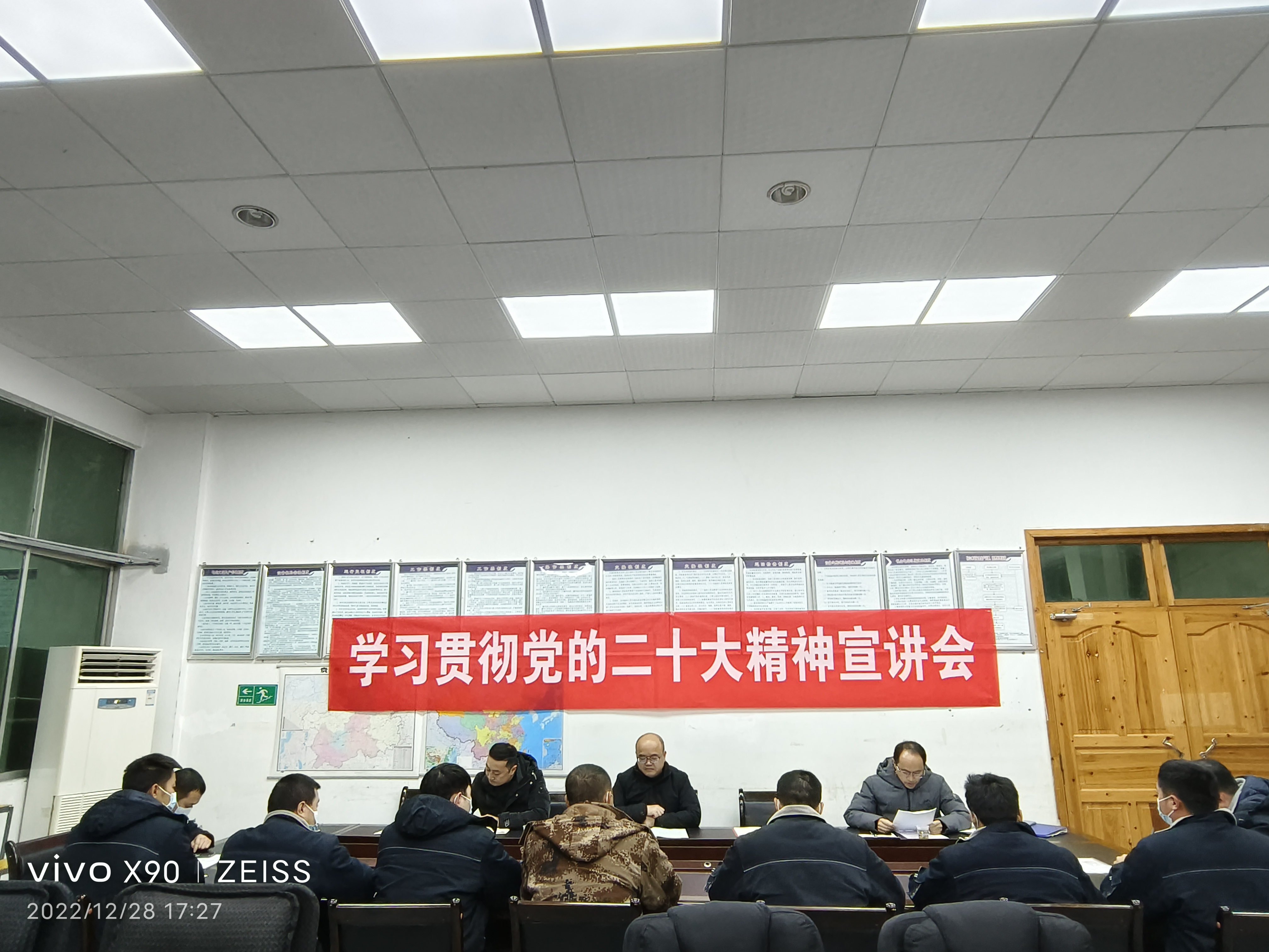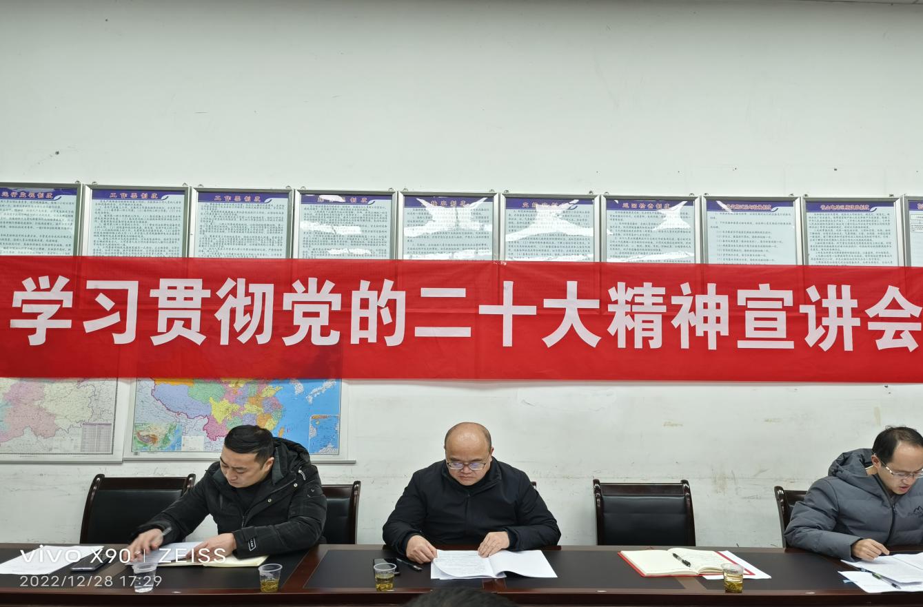 2022年12月28日,省聚新水利公司副总经理(主持经营工作)罗世友到所属企业贵州花山河水电开发有限公司宣讲党的二十大精神,公司人力资源部(党办)吴文敏、工程技术部方启彬陪同,花山河公司经理杨钰峰主持宣讲会,花山河公司全体职工参加。